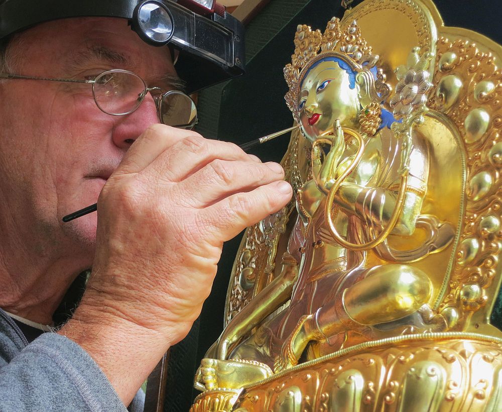 gilded copper repoussé with green, yellow and white gold leaf, and Swarovski crystals. The hands cast from wax models.